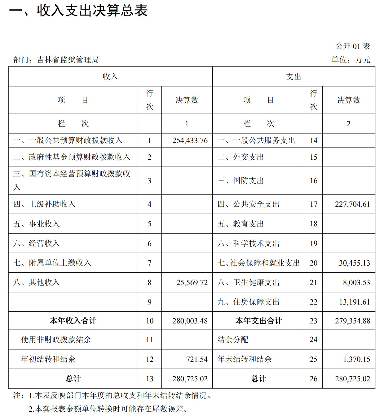 吉林省监狱管理局2024年度部门决算收入支出决算总表