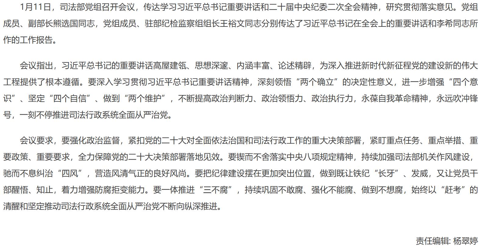 司法部党组召开会议 传达学习习近平总书记 在二十届中央纪委二次全会上的重要讲话精神