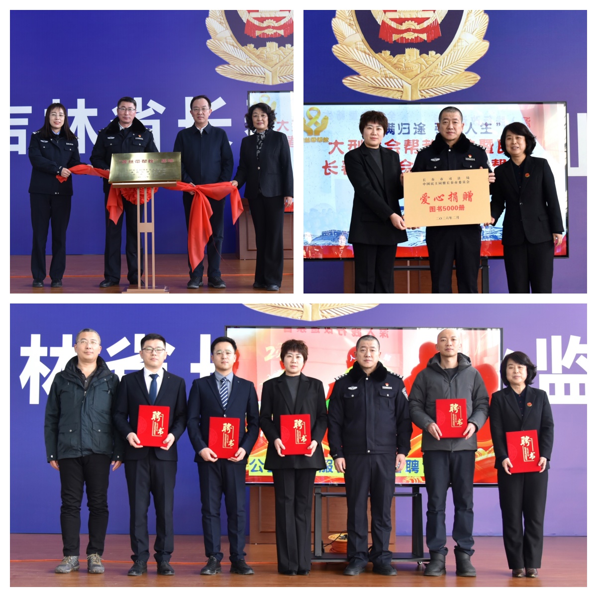 近日,长春市司法局、民盟长春市委会、监狱管理局领导和监狱领导共同为兴业监狱“黄丝带帮教”实践基地揭牌。长春市司法局人民参与和促进法治处处长高明为就业安置辅导员发放聘书,民盟长春市委会社会服务部部长付大为为民盟志愿者、法律援助工作者、心理咨询师发放聘书。北京中盾(长春)律师事务所主任赵丹向监狱捐赠5000册图书。