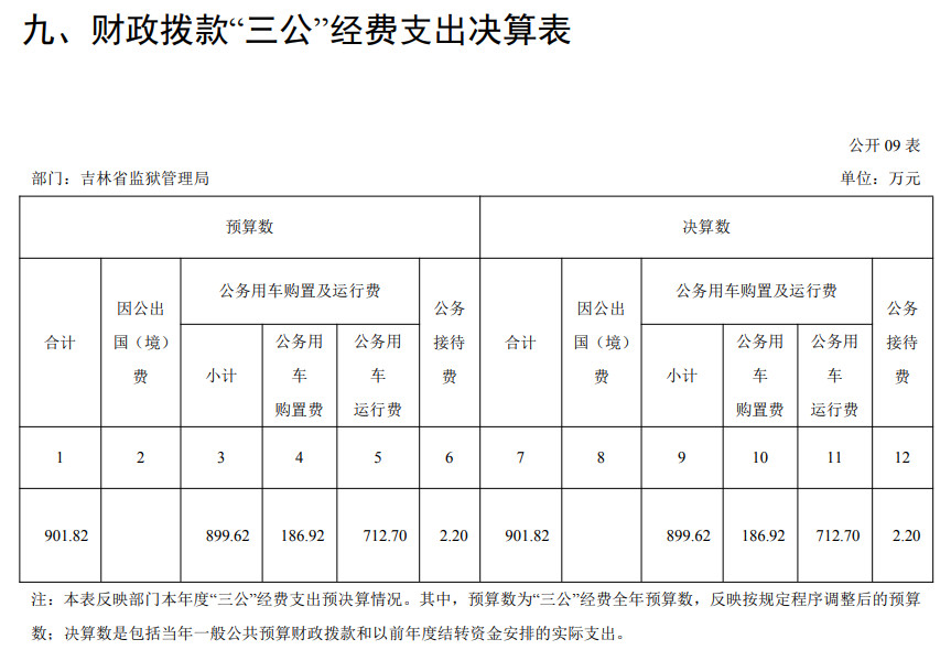 吉林省监狱管理局2024年度部门决算财政拨款“三公”经费支出决算表