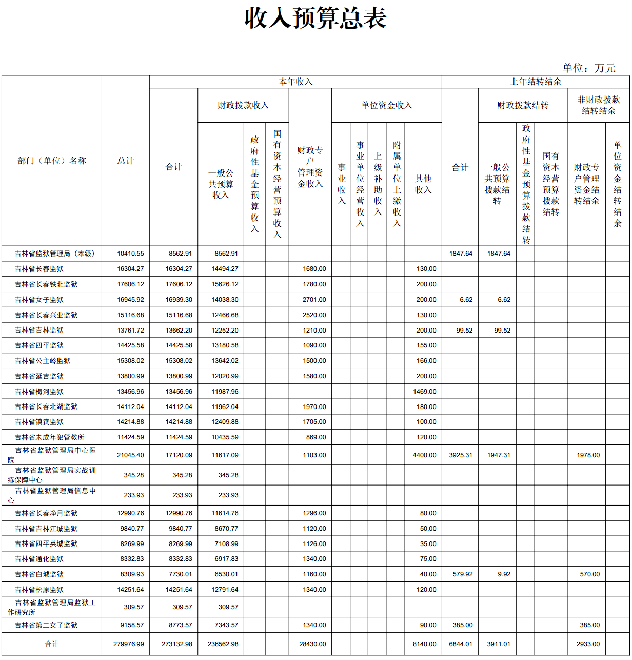 吉林省监狱管理局2026年收入预算总表